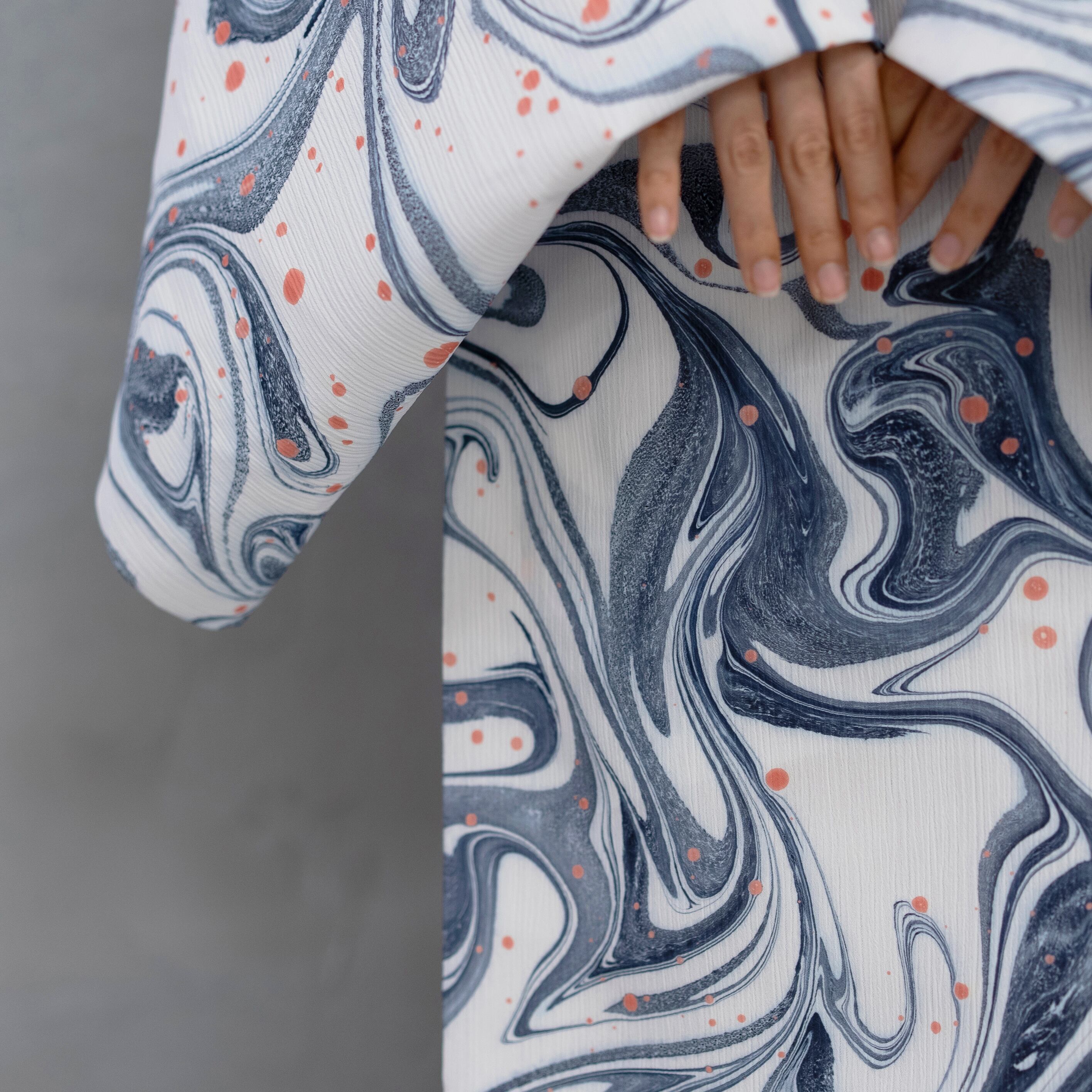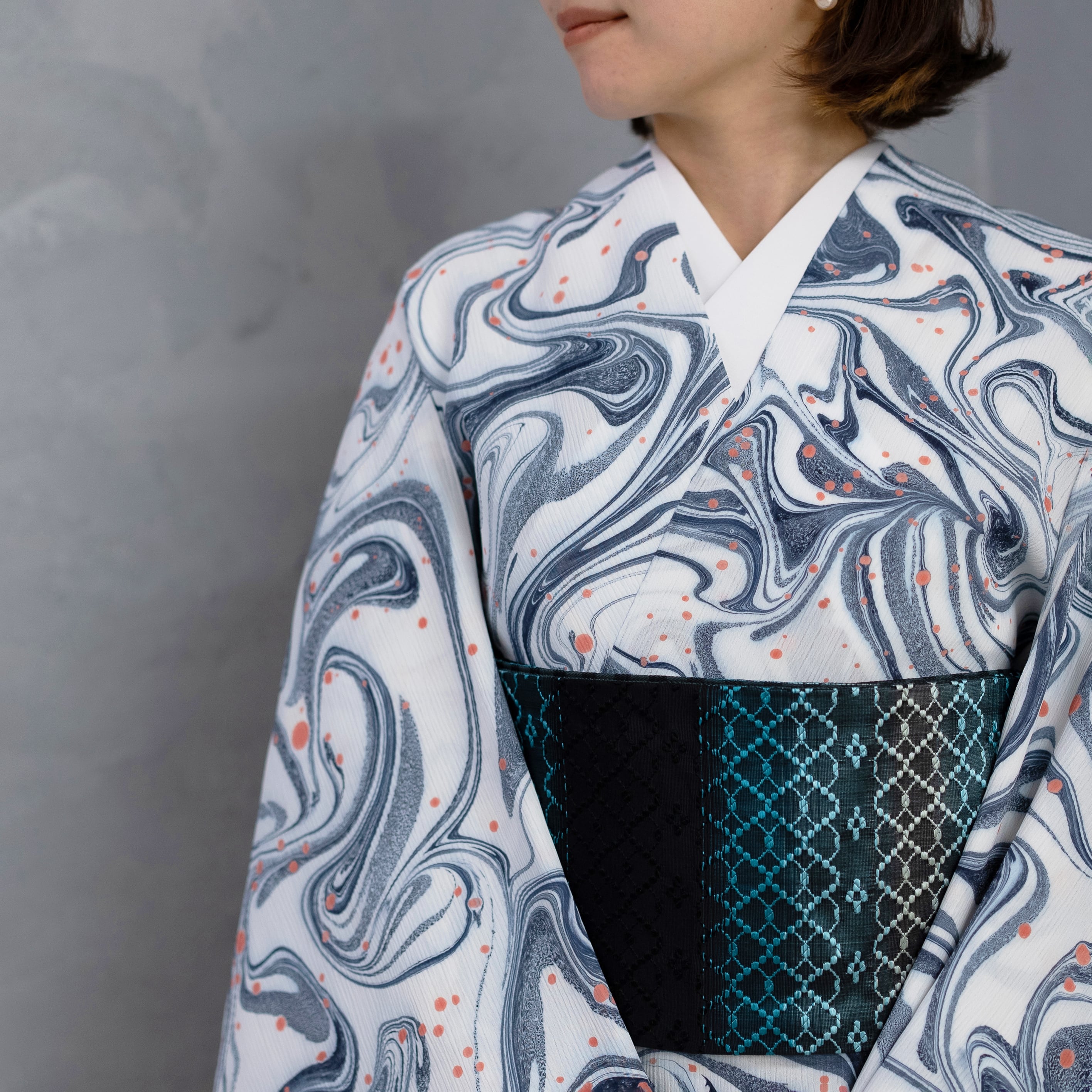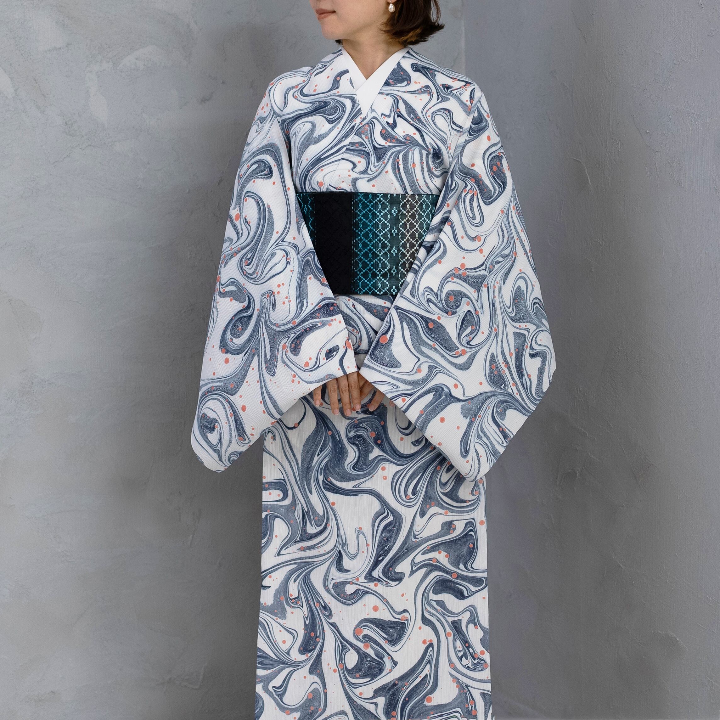 セオアルファ楊柳の生地に大きいマーブル柄をダイナミックに描いた作品です。上質な楊柳生地を使用し、涼しげで軽やかな着心地を実現しています。手染めならではのマーブル模様が個性を引き立て、夏の装い〜秋口まで華やかに演出します。
