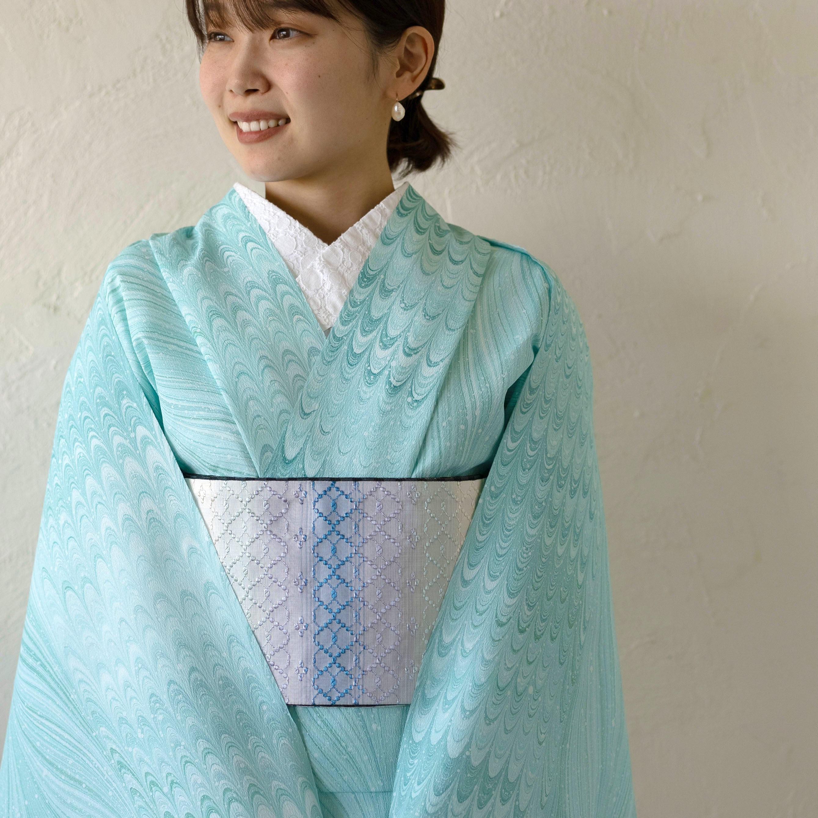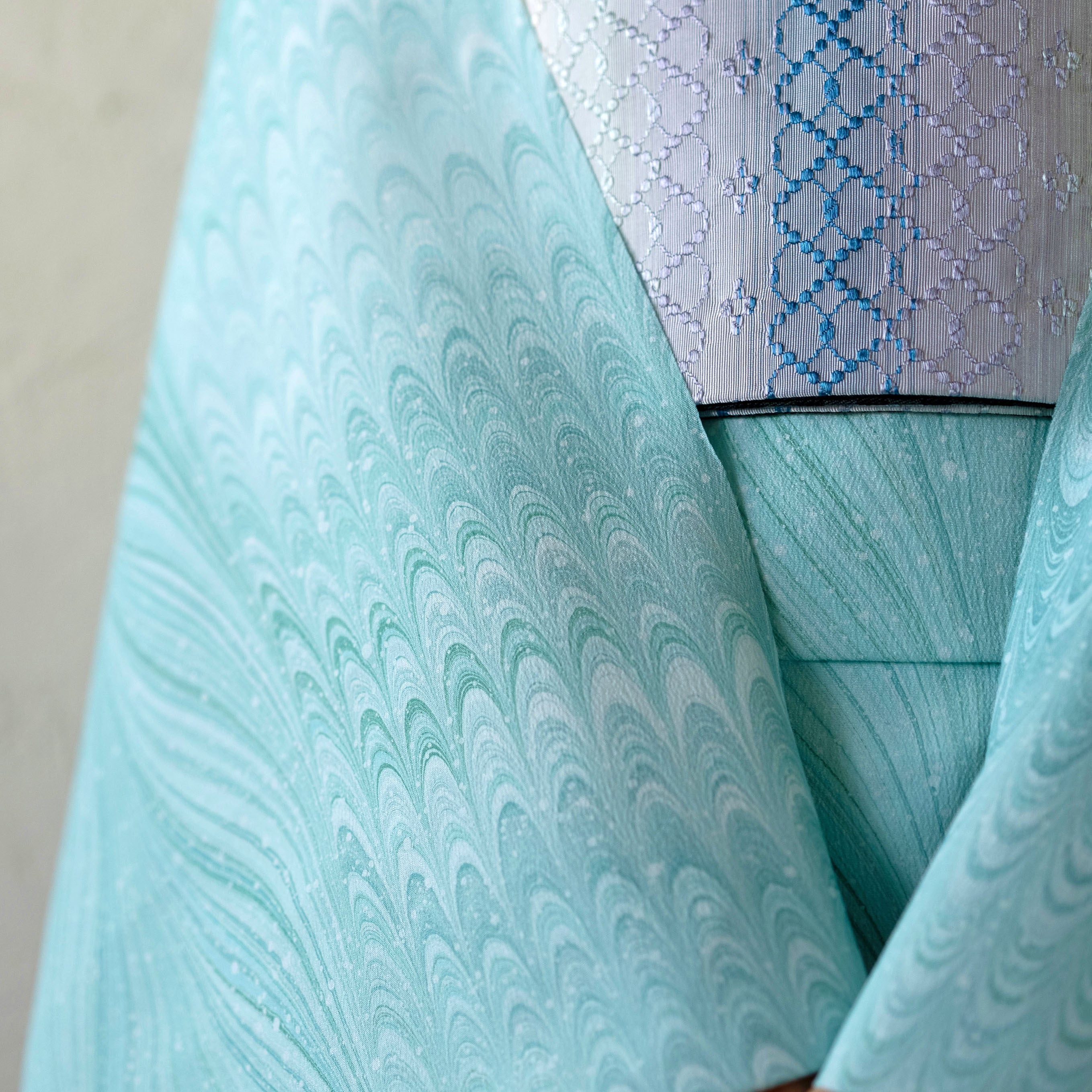 使用された6色の異なるブルーは、特別な手法で繊細に調和し、どこか透明感と静けさを感じさせる美しい色彩を織りなしています。その結果生まれる色合いは、お肌を明るく引き立て、華やかさを添えてくれます。
