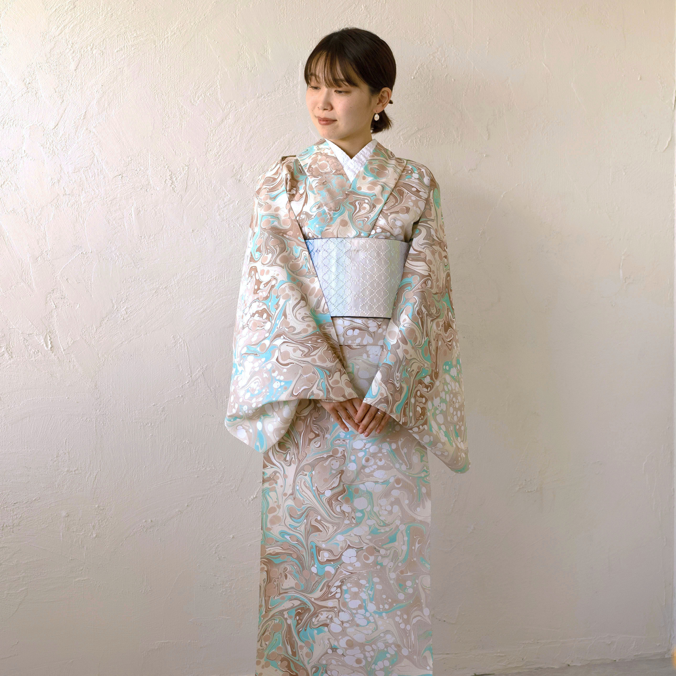 「シンデレラベージュ」❤︎マーブル柄×ドット〜洗えるきもの(シルジェリー)〜
