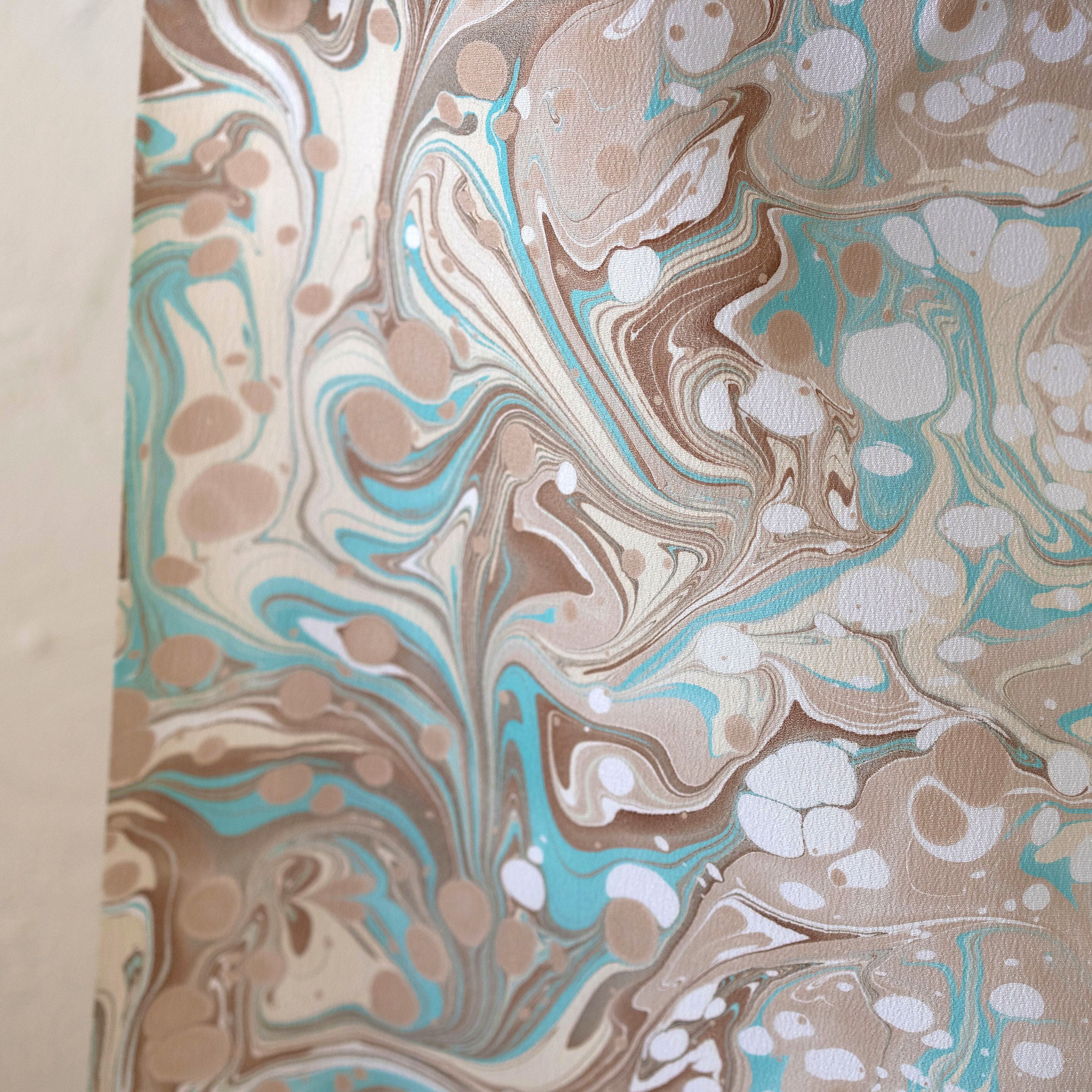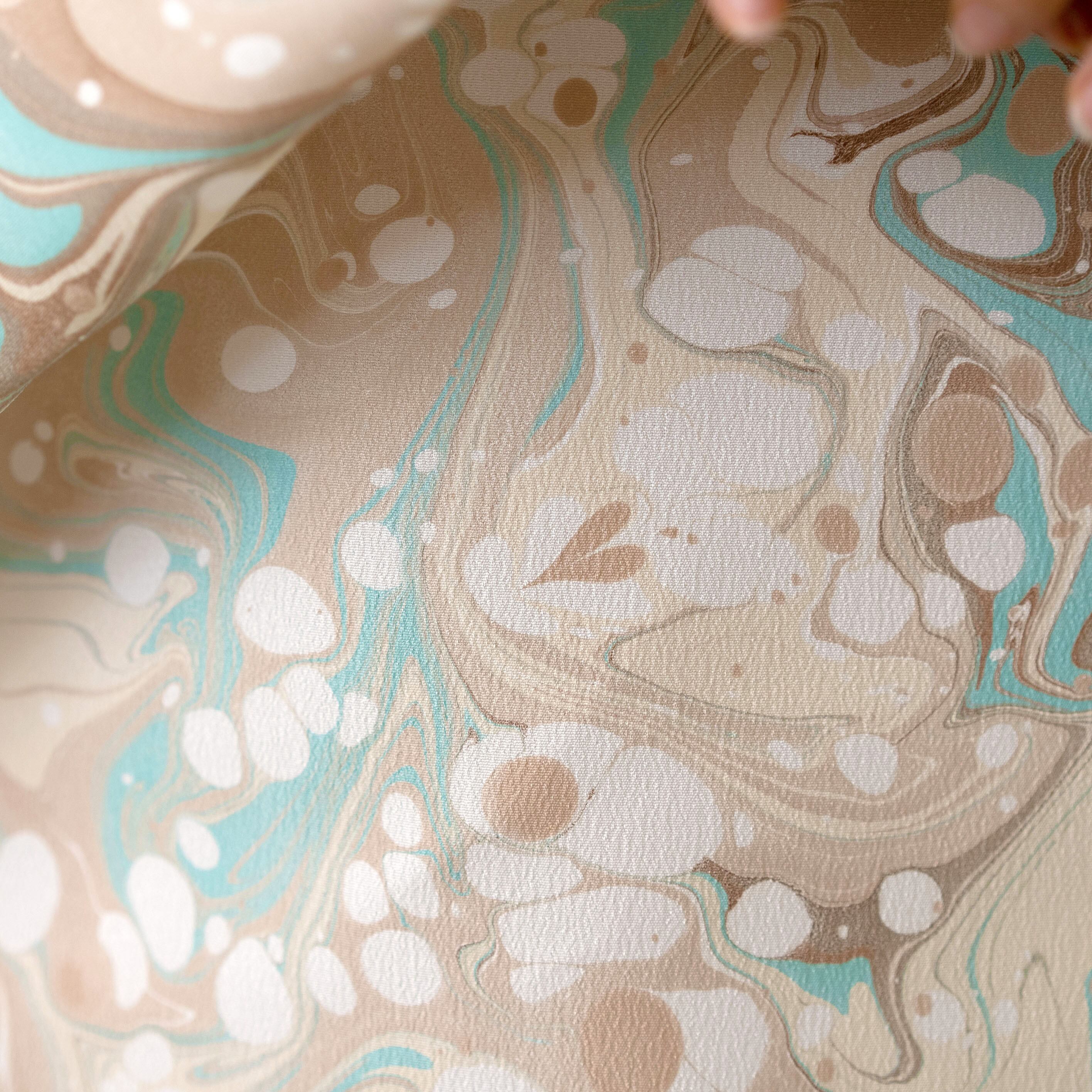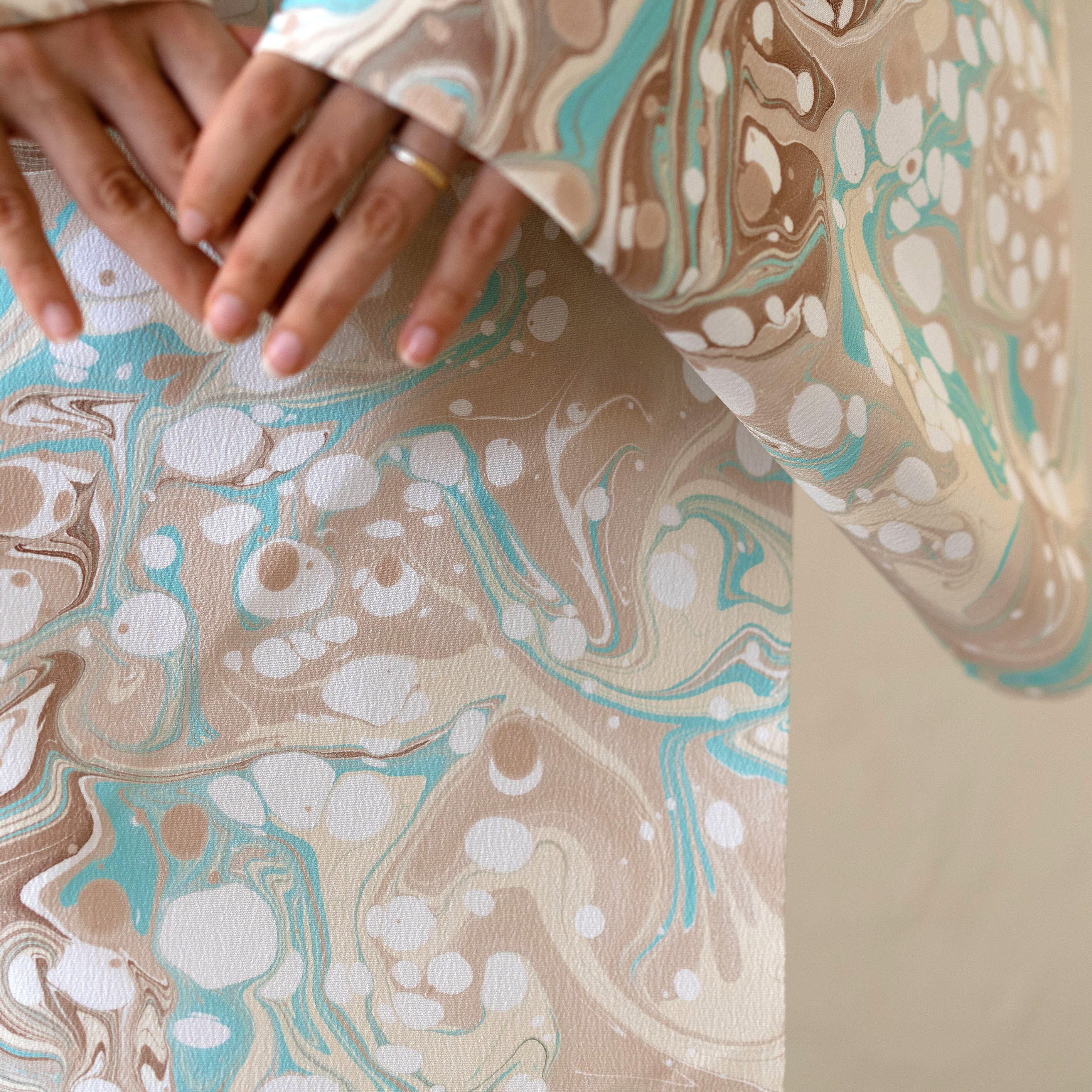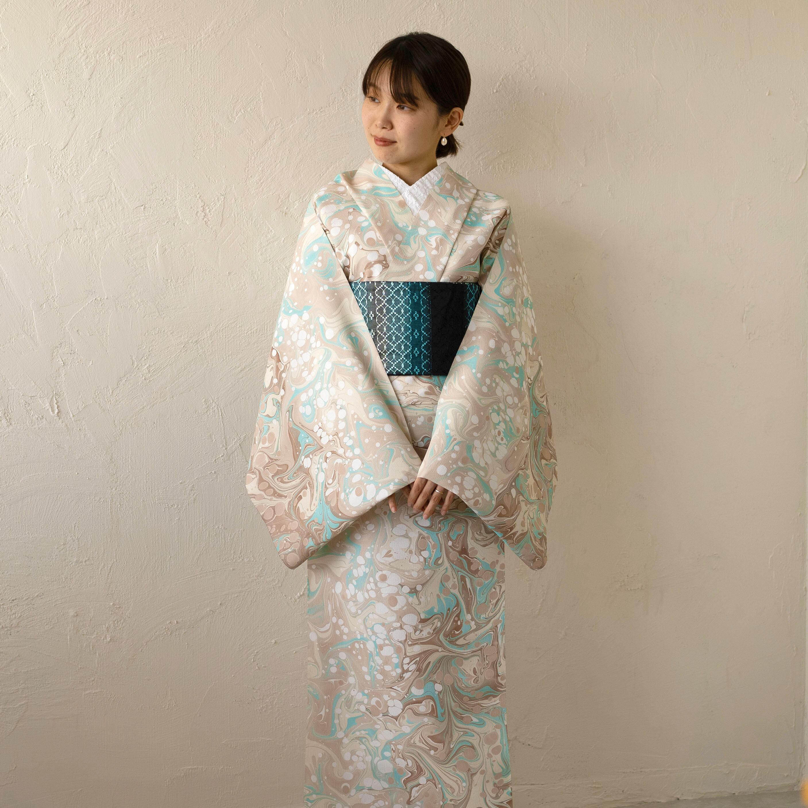 ロイヤルベージュ、ブラウン、ターコイズブルー、ベージュといった多彩な色合いを縦に染め分けた作品です。水の動きを巧みに表現したマーブル柄には、白とブラウンの2色のドットが散りばめられ、隠されたハートがさりげないアクセントに。縦に染め分けることで、仕立て方次第で異なる表情を楽しむことができます。どの角度から見ても魅力的な一着です。