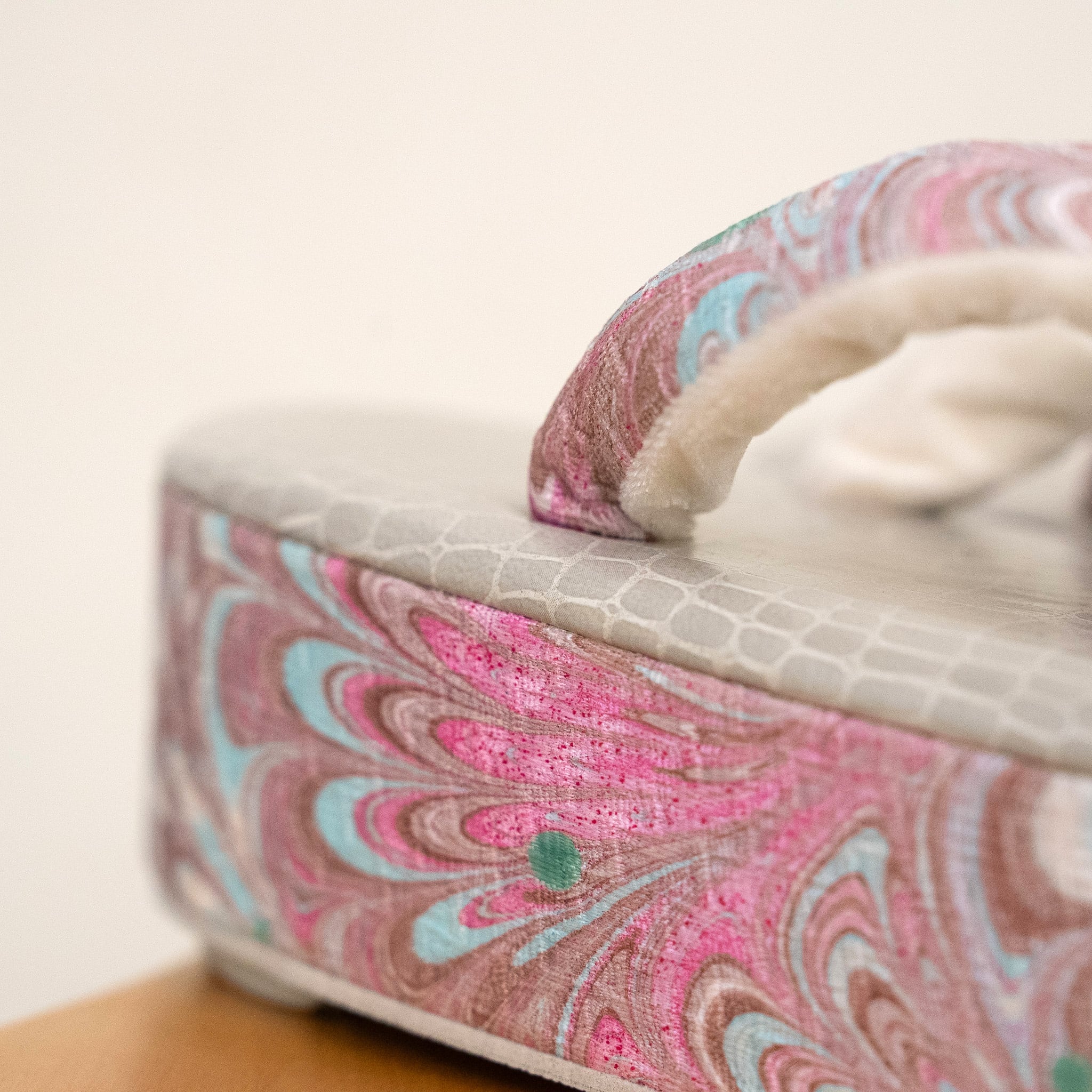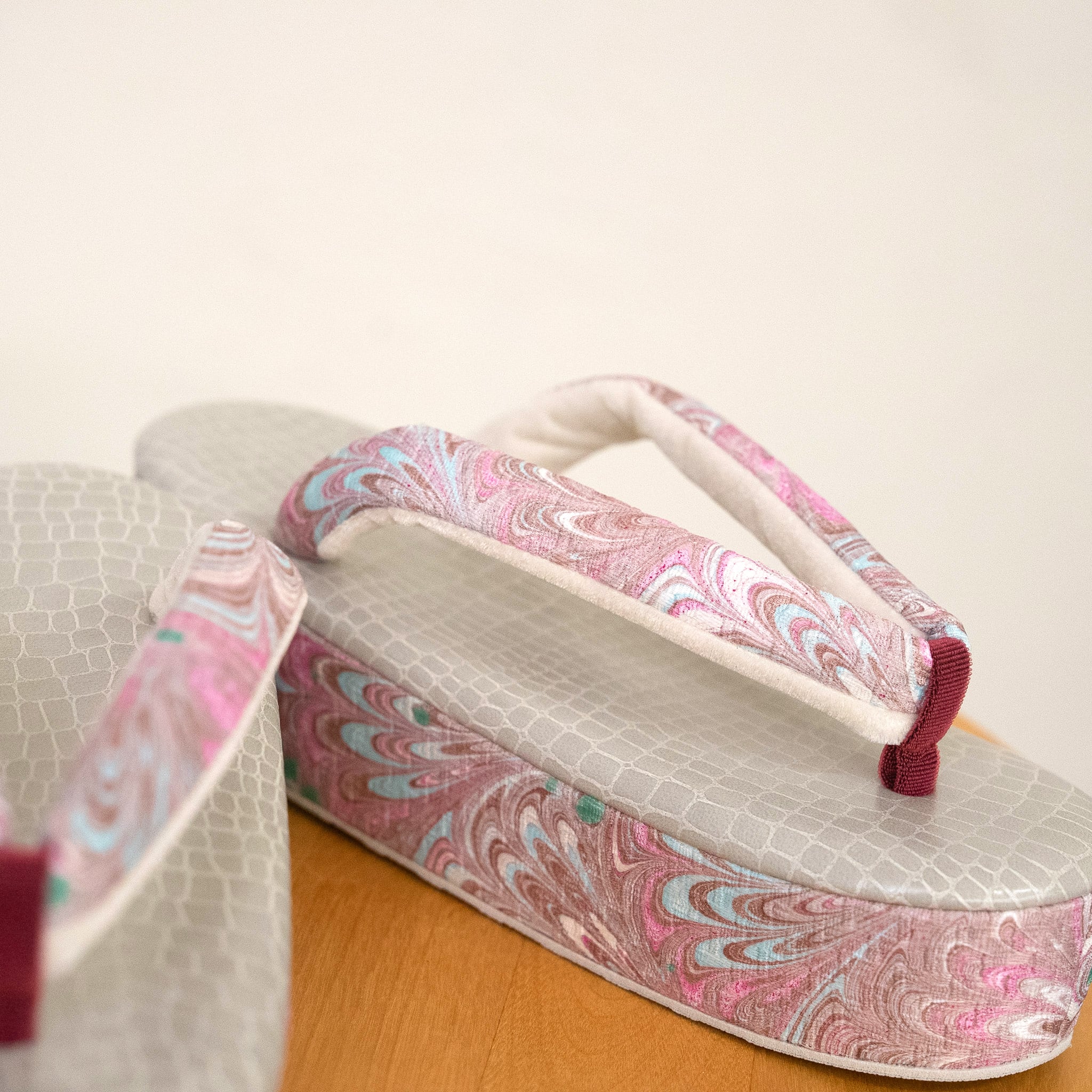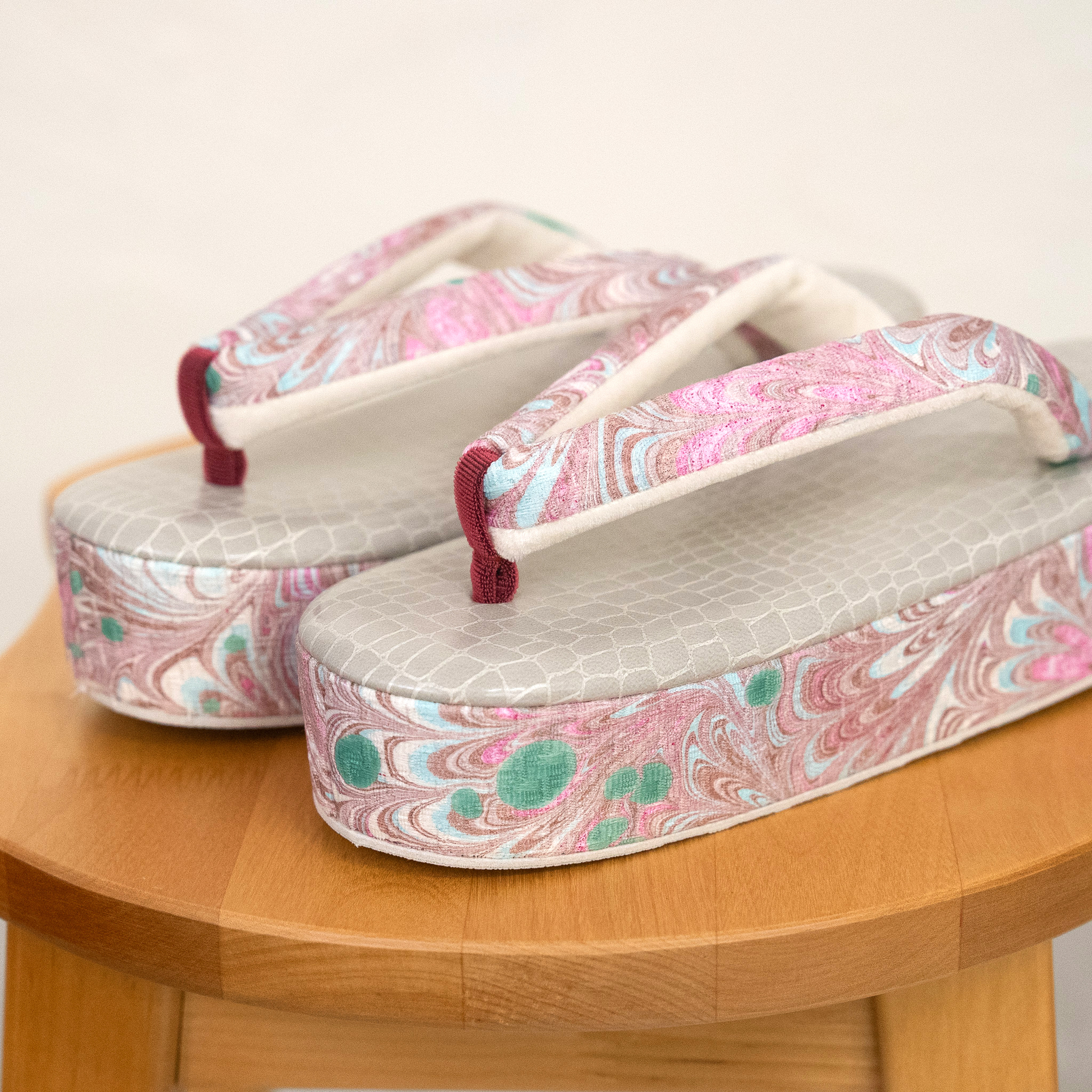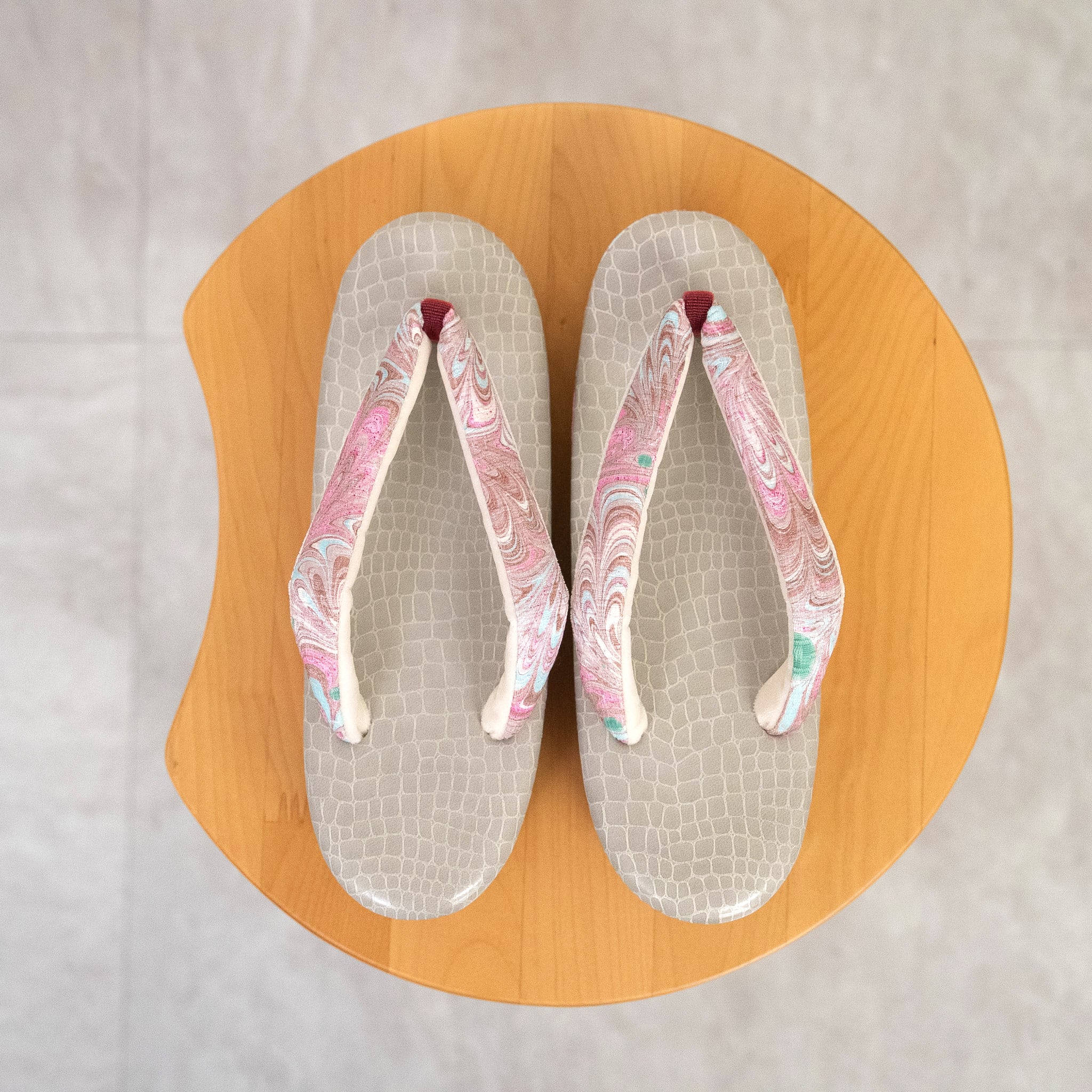 墨流し技法で一点ずつ手染めされた生地を、鼻緒と側面にあしらった草履です。
