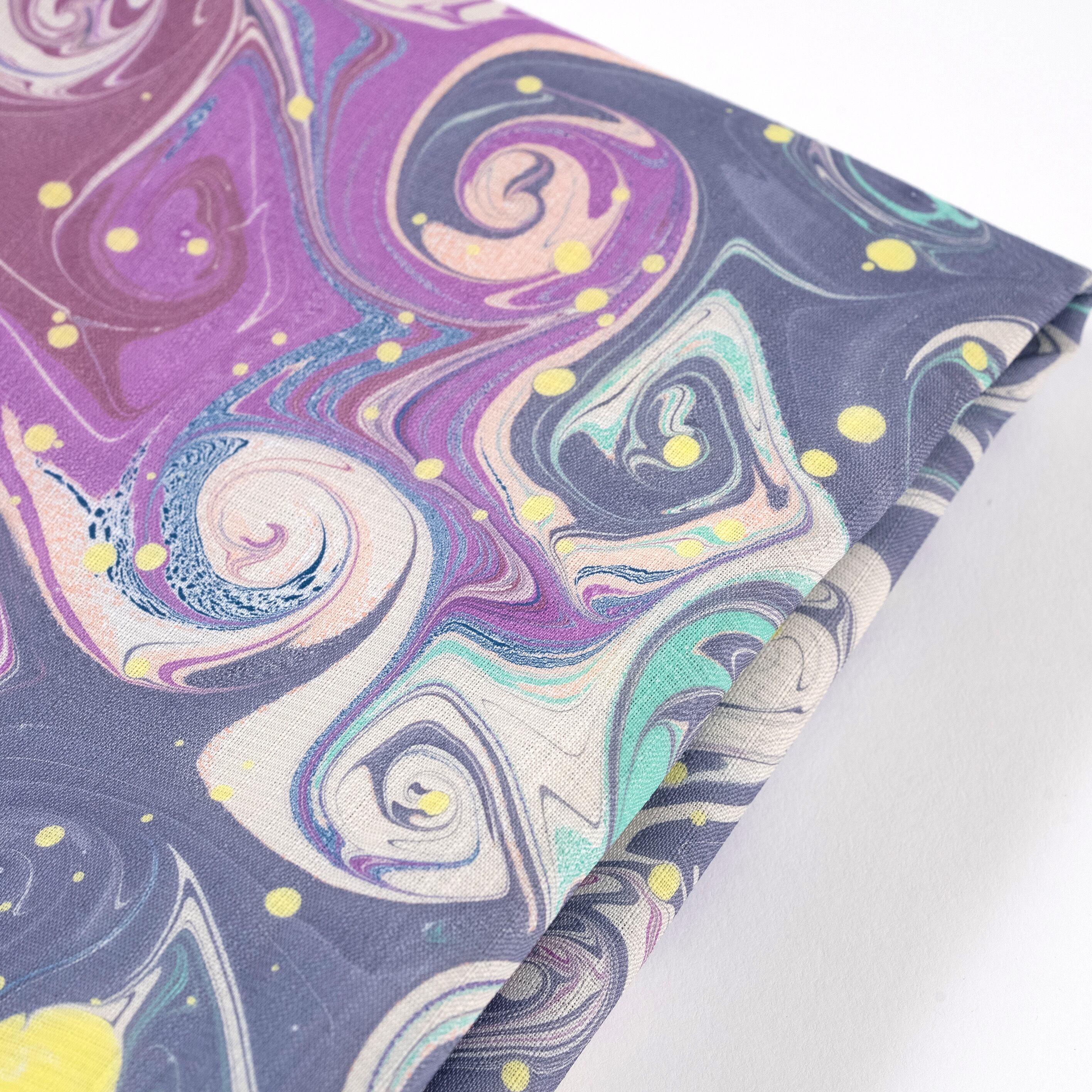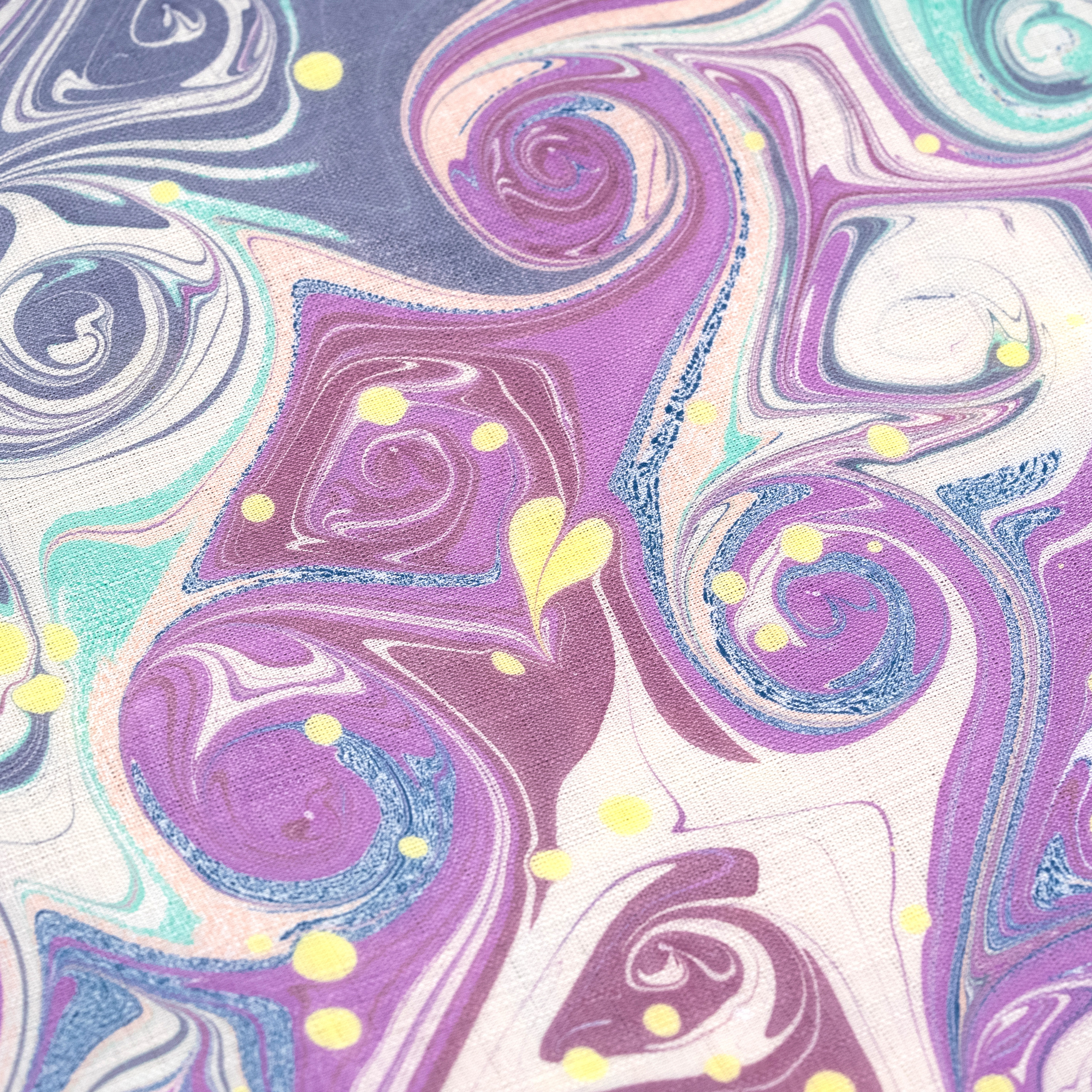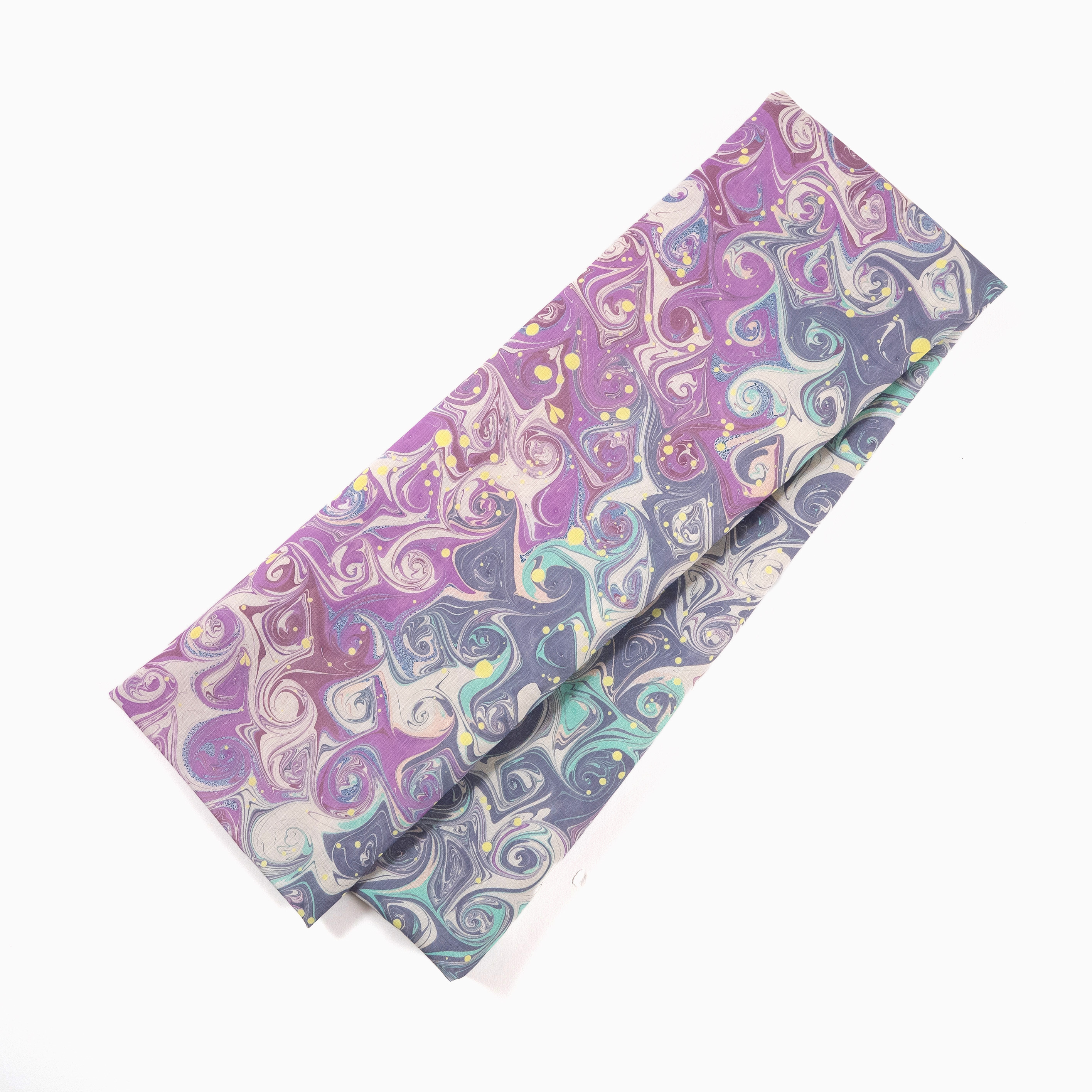 パープルと紺色の色彩が織りなす墨流し模様が、まるで春風に乗る花びらのような優しさを感じさせるリバーシブルの半幅帯。片面は深みのある紫を基調に、もう片面は軽やかなミントグリーンのアクセントが広がるデザイン。どちらの面を選んでも、和装に明るく華やかな印象を与えてくれます。