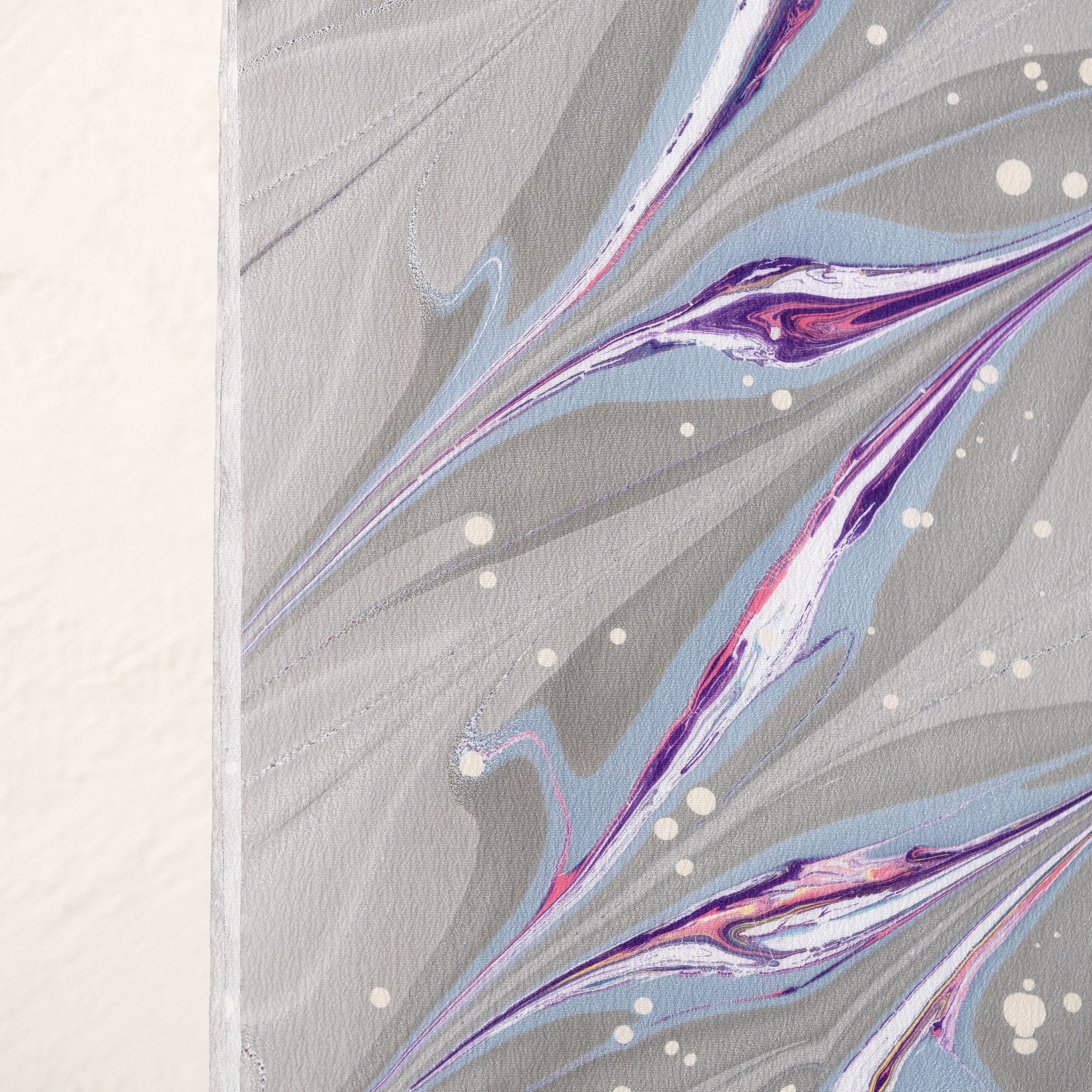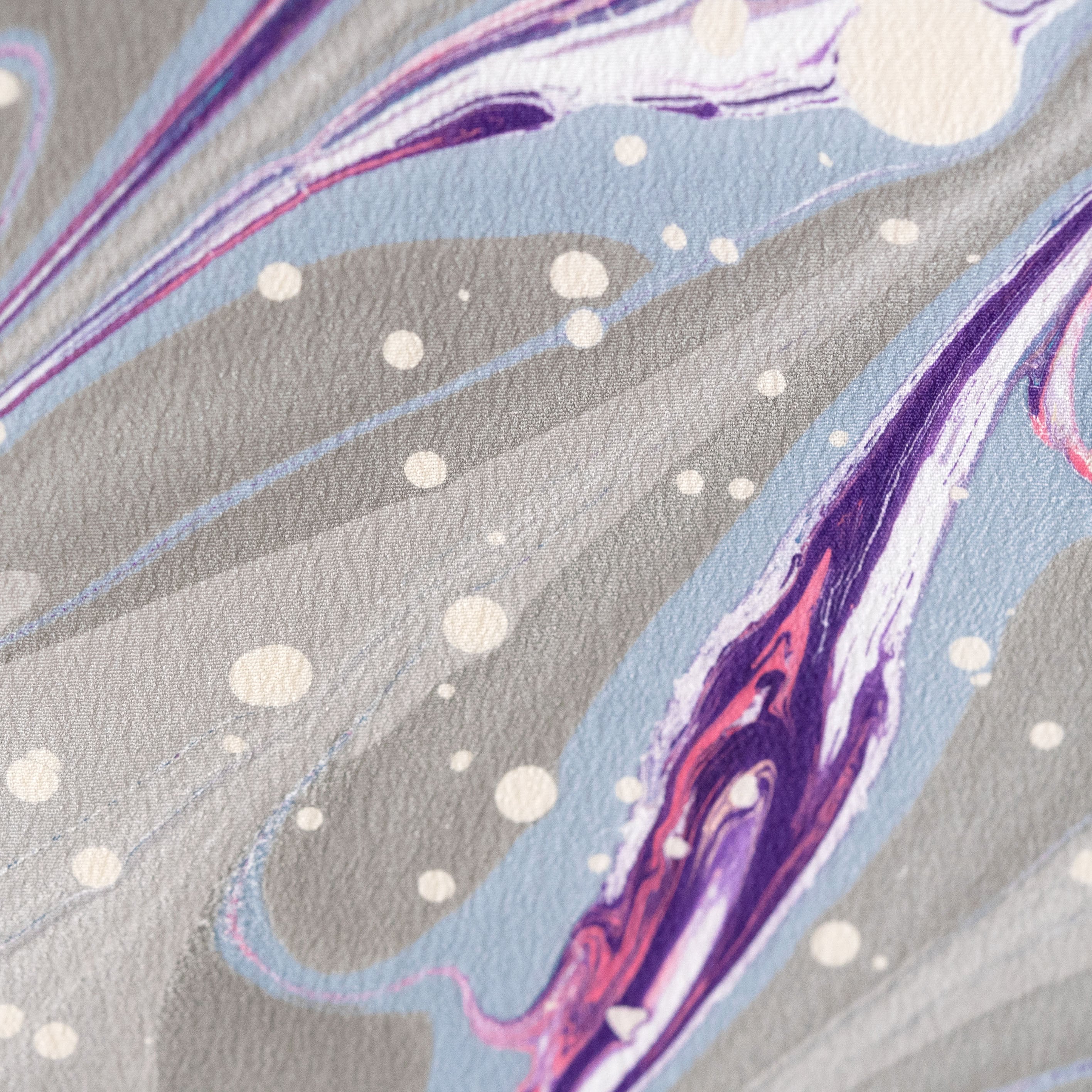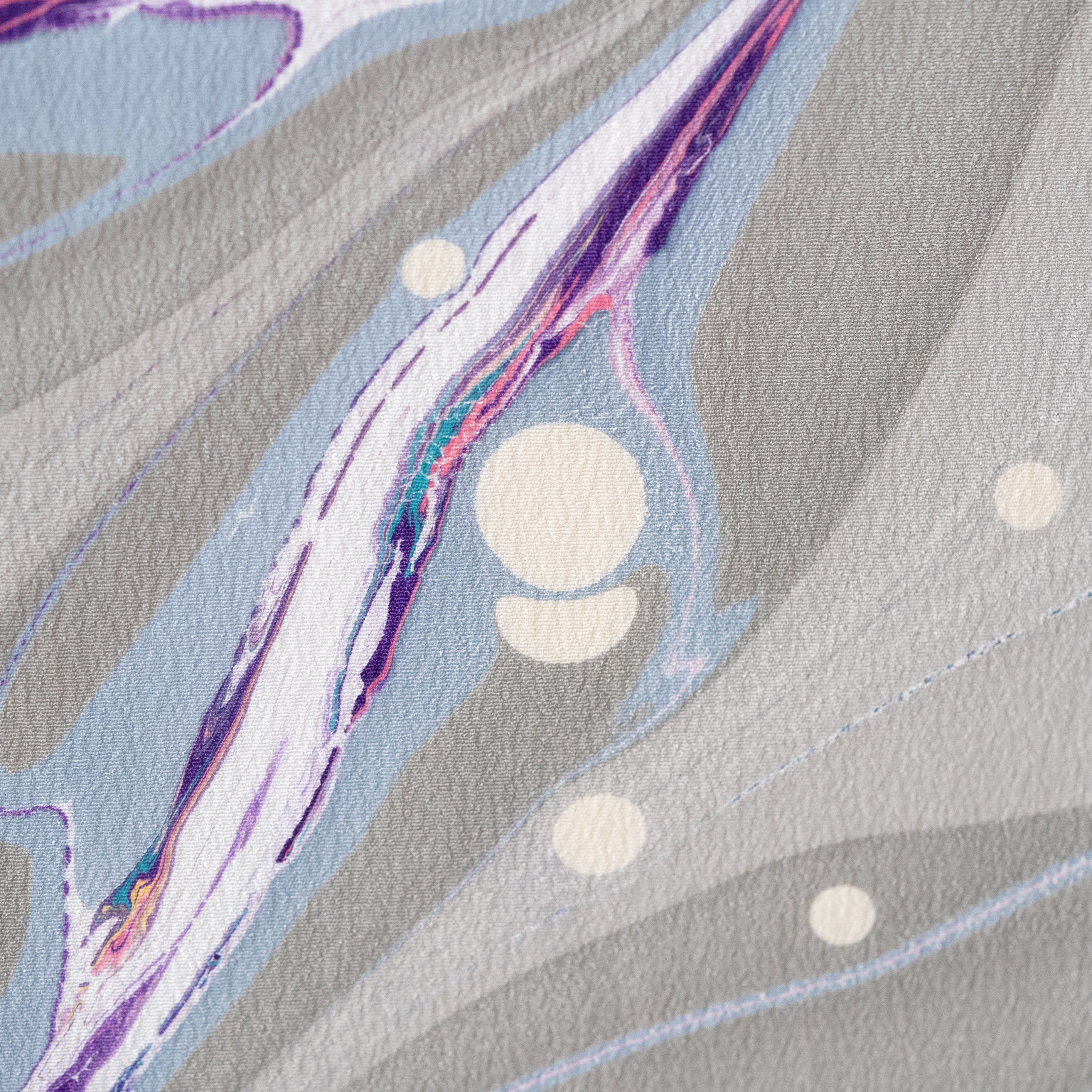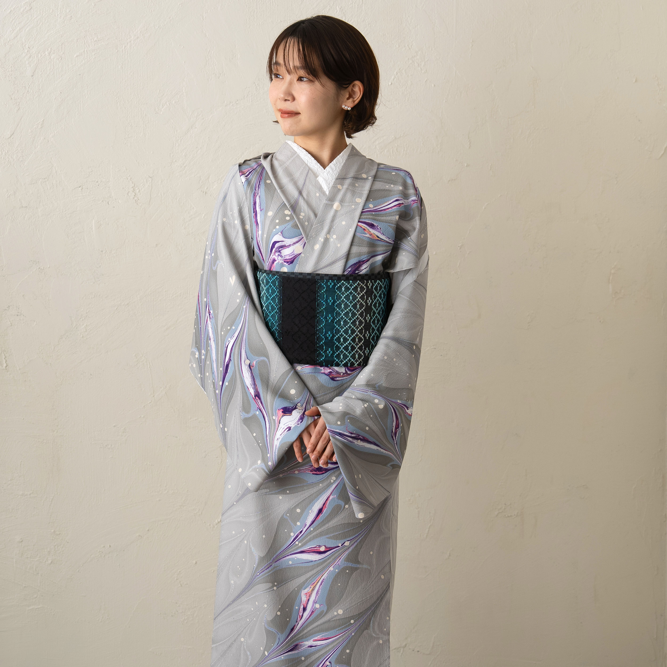 シルバーグレーを基調に、深みのある紫と淡いブルーが織りなす模様は、まるで宇宙に漂う光の軌跡のよう。