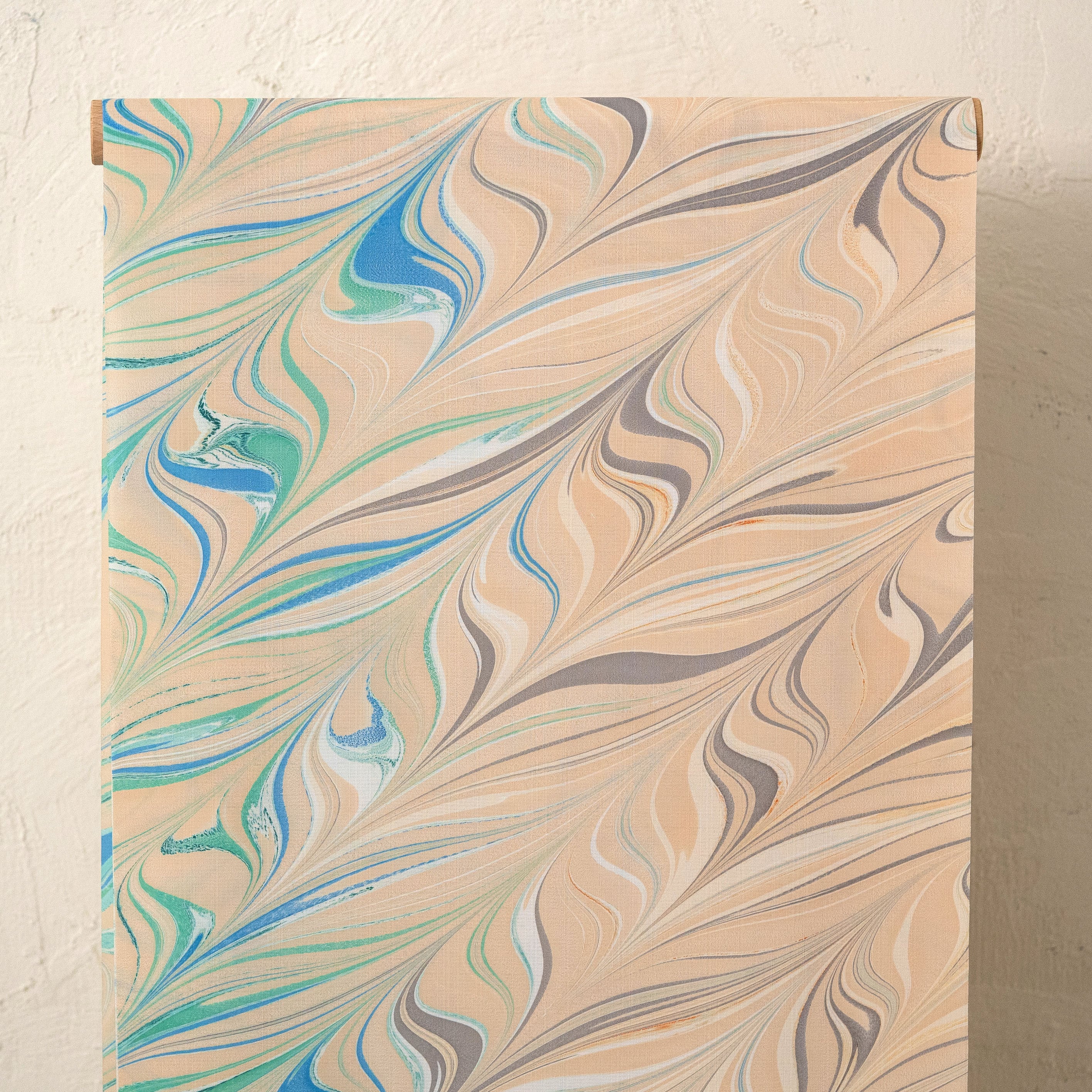 淡いベージュの地色に、ターコイズブルーとグリーンの繊細なグラデーションが重なり、まるで波紋が広がるようなデザインです。