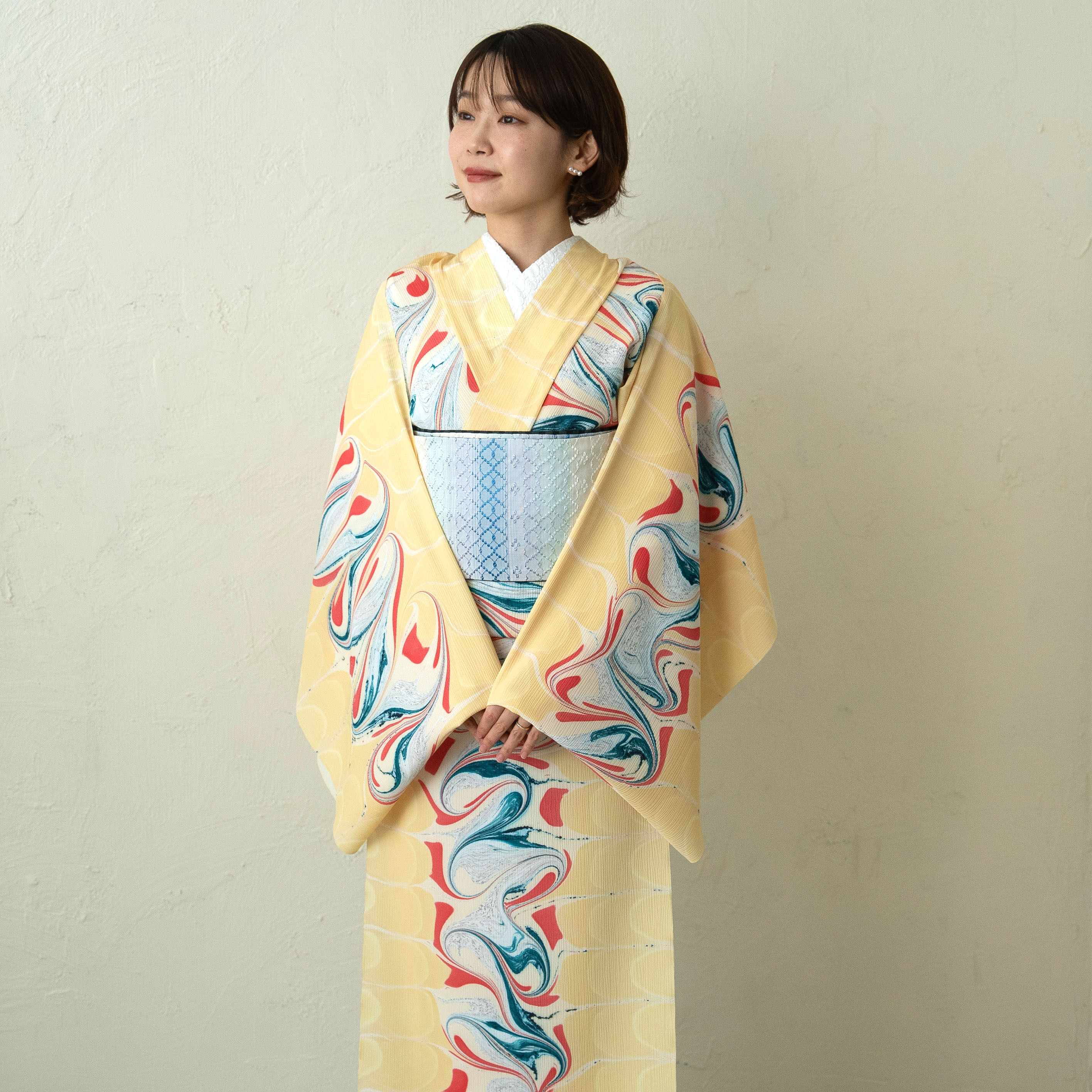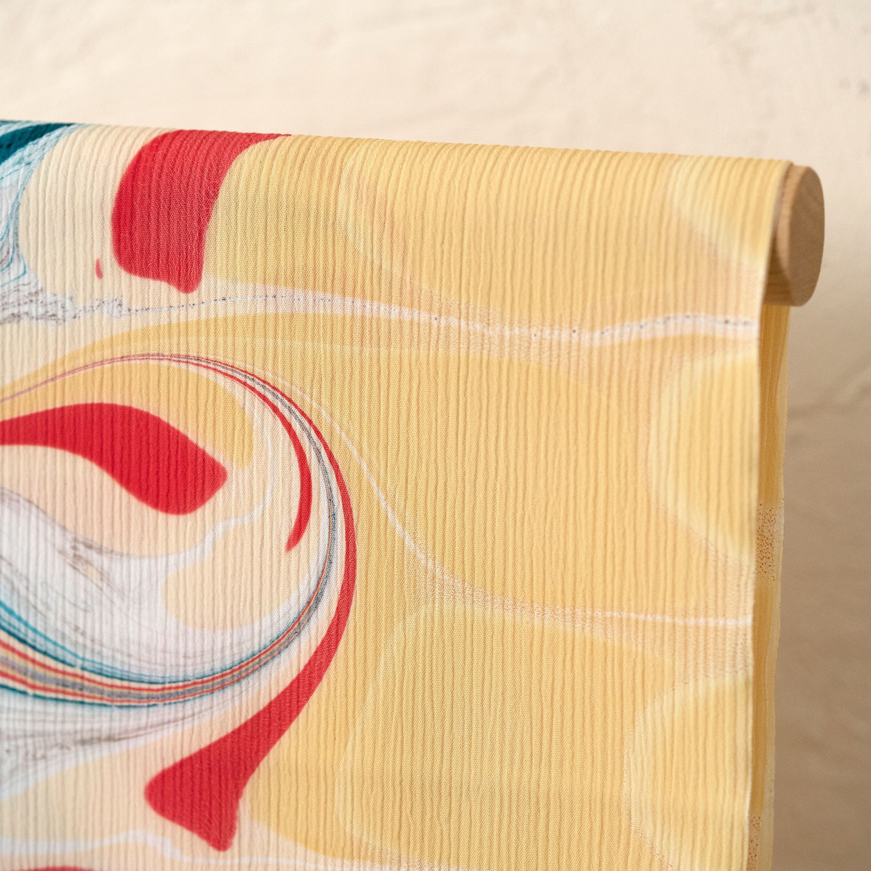 柔らかな陽だまりのような淡いイエローを基調とし、その上に流れる墨流しの模様が、まるで幻想的な風景を描き出すような作品。