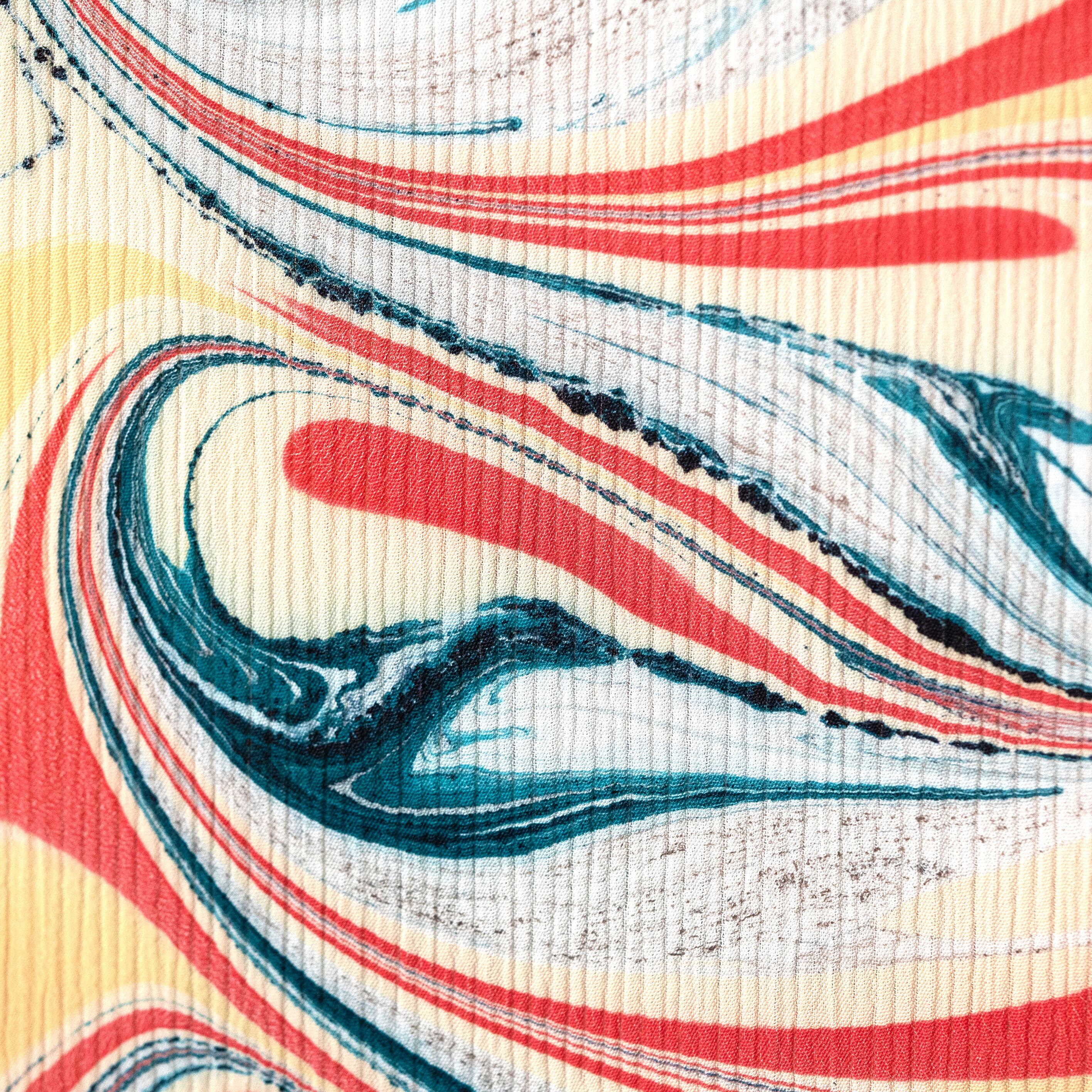 波のように揺らめくターコイズブルーと鮮やかな朱色が、温かみのある背景と調和し、着る人の表情に輝きをもたらします。