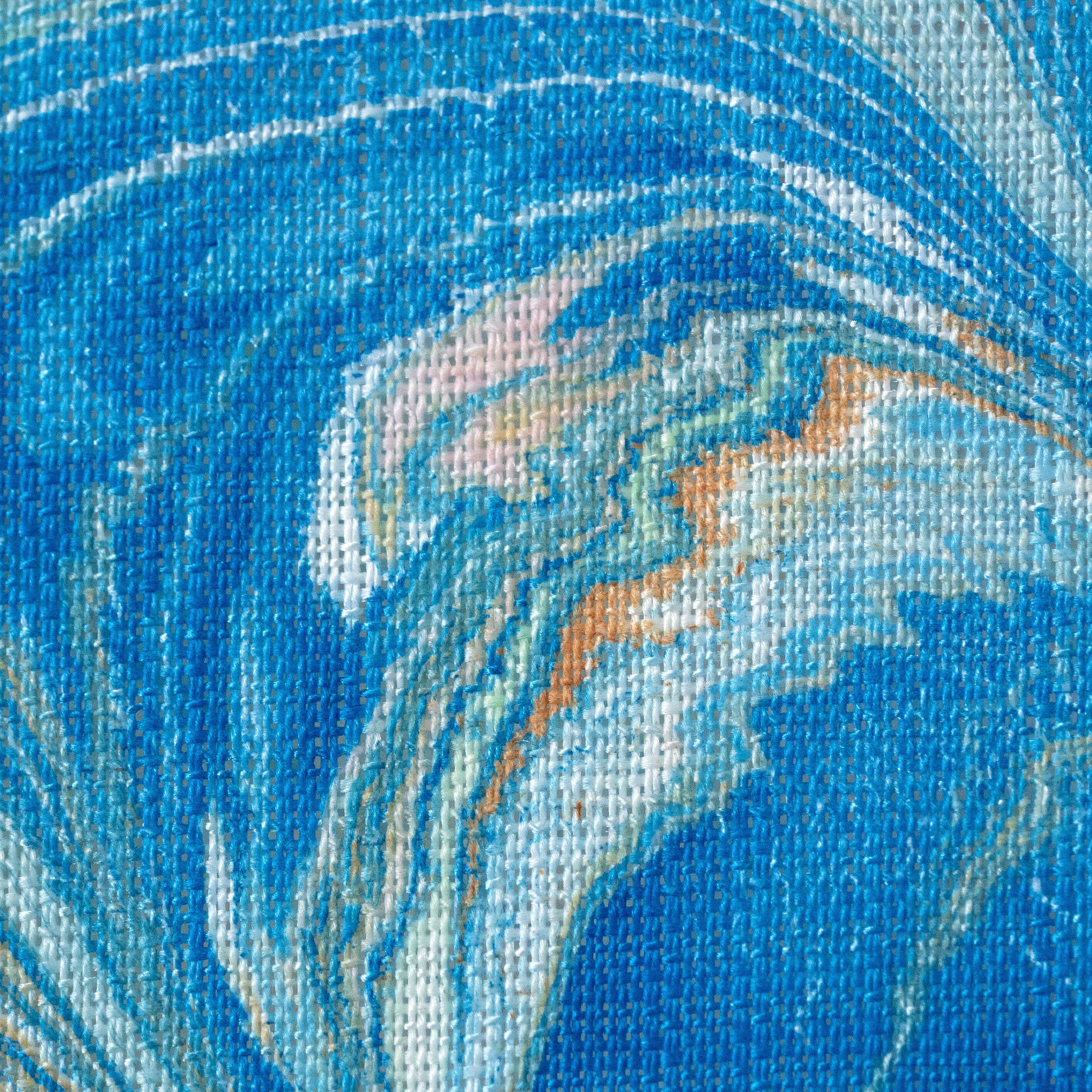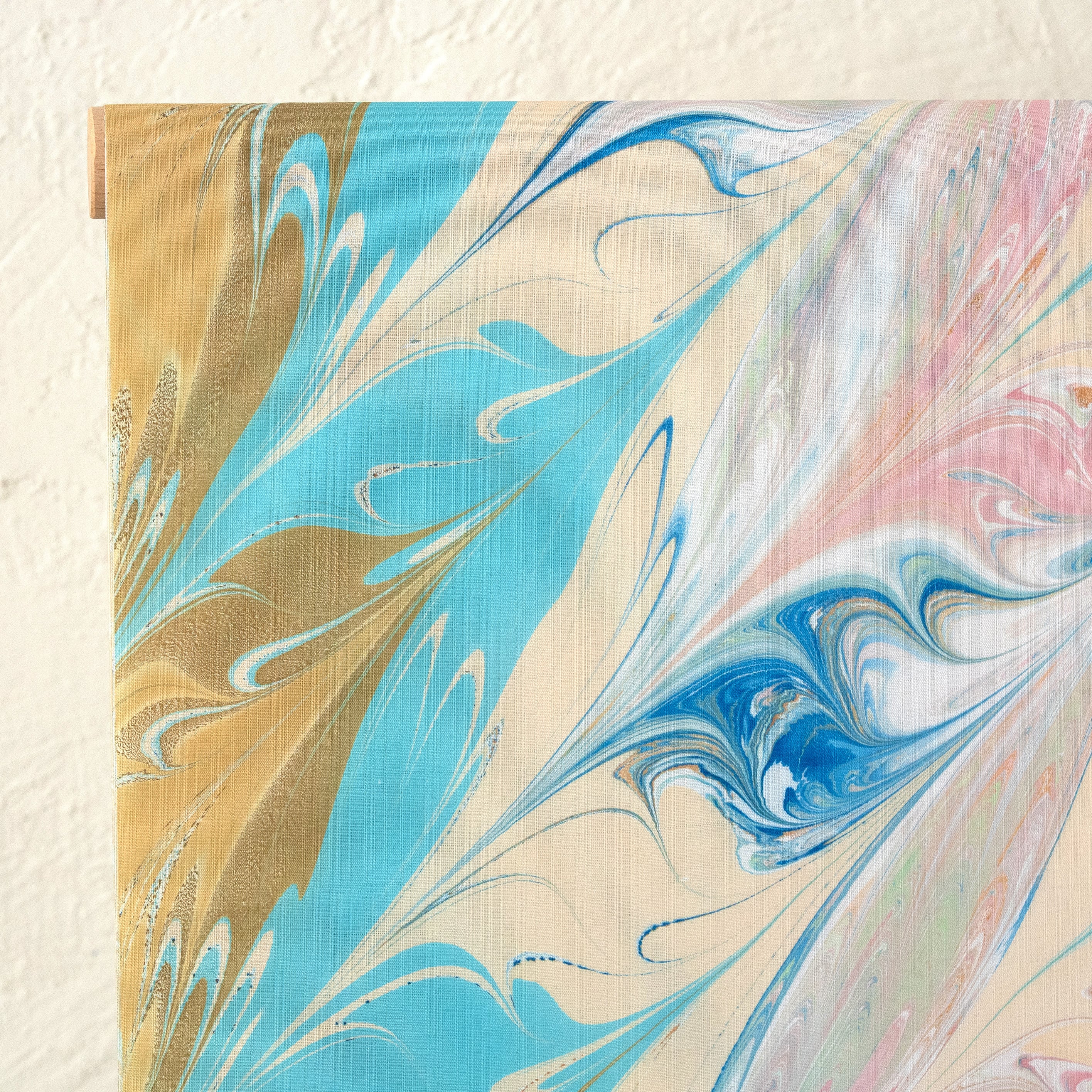 ブルー、ゴールド、ピンクが絶妙に混ざり合い、まるで春風に乗る花びらのような優雅な動きを表現しています。